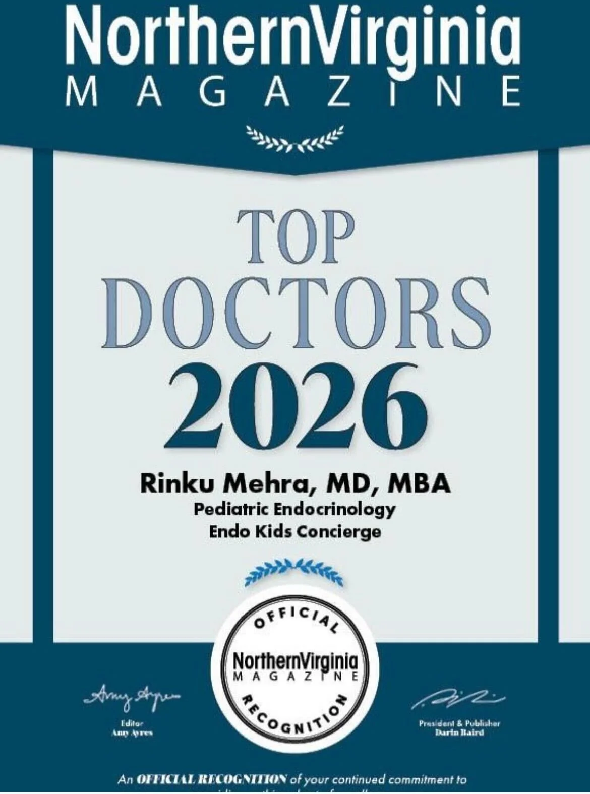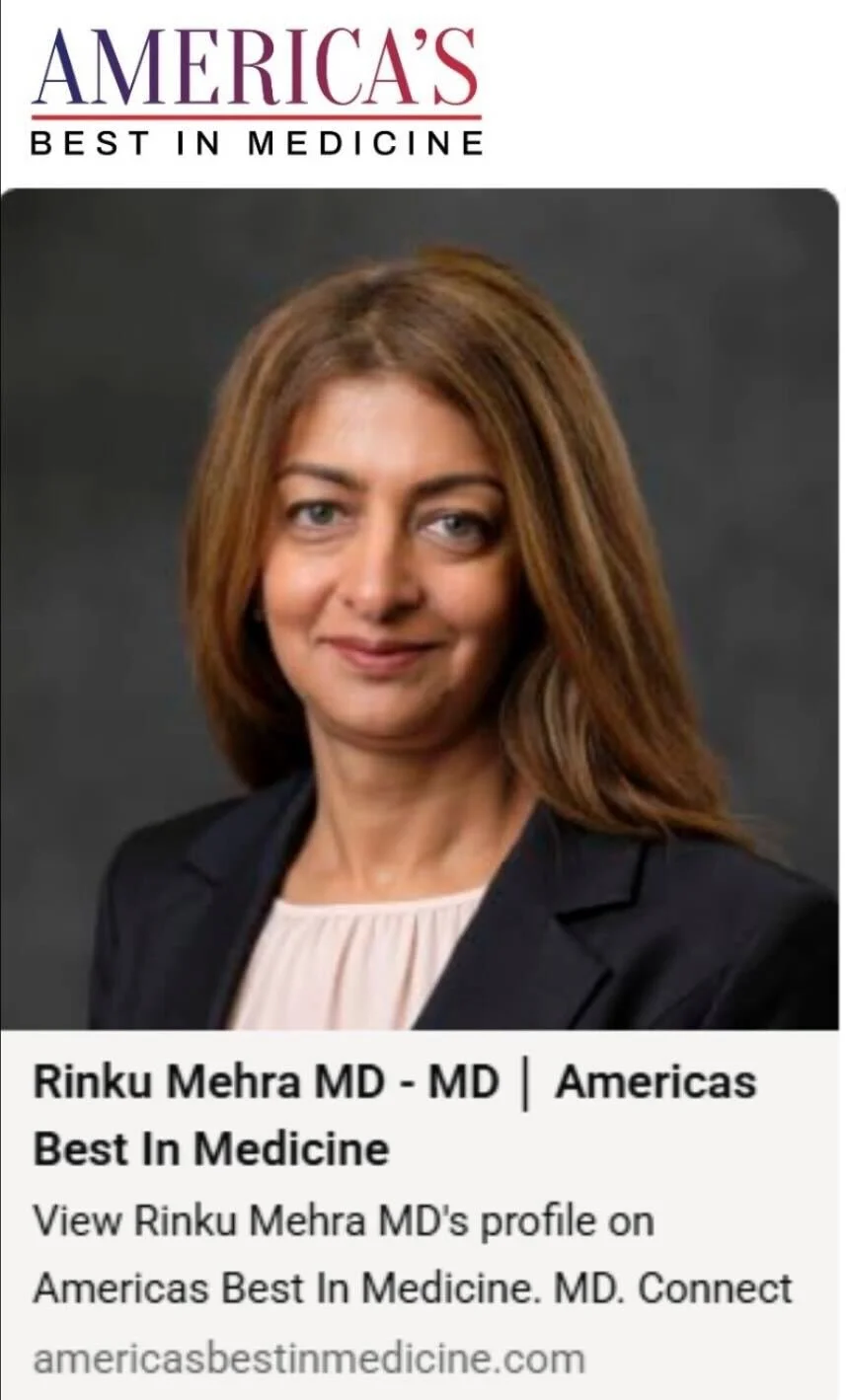 Dr. Mehra was named a Top Doctor by Arlington Magazine in 2024, Northern Virginia Magazine each year from 2015-2026 and a Top Doctor by Washingtonian Magazine in 2019 and 2020, 2023 and 2024. In 2022, she earned her Physician Executive MBA from The University of Tennessee’s Haslam School of Business.